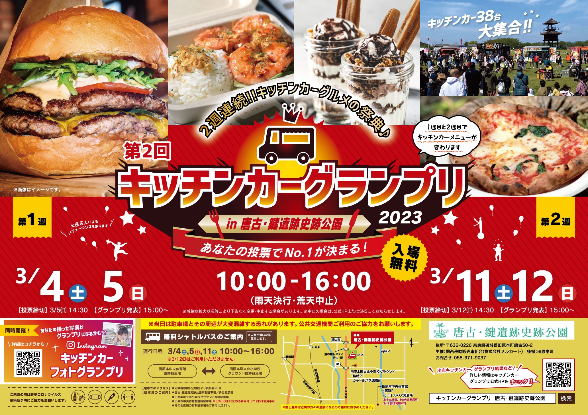 昨年大好評を博したキッチンカーグランプリ、今年も奈良県田原本町の唐古・鍵遺跡史跡公園で開催します。今回はなんと1日あたり38台ものキッチンカーが集合。入場無料、2週連続開催!この機会をお見逃しなく!