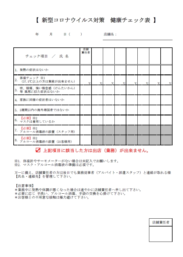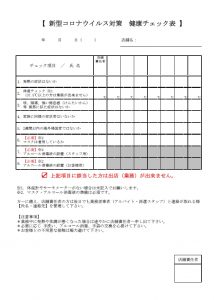 東海移動販売車組合・関西移動販売車組合ではオリジナルの「新型コロナウイルス対策 健康チェック表」を作成しました。