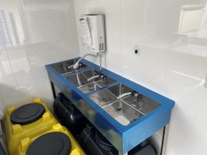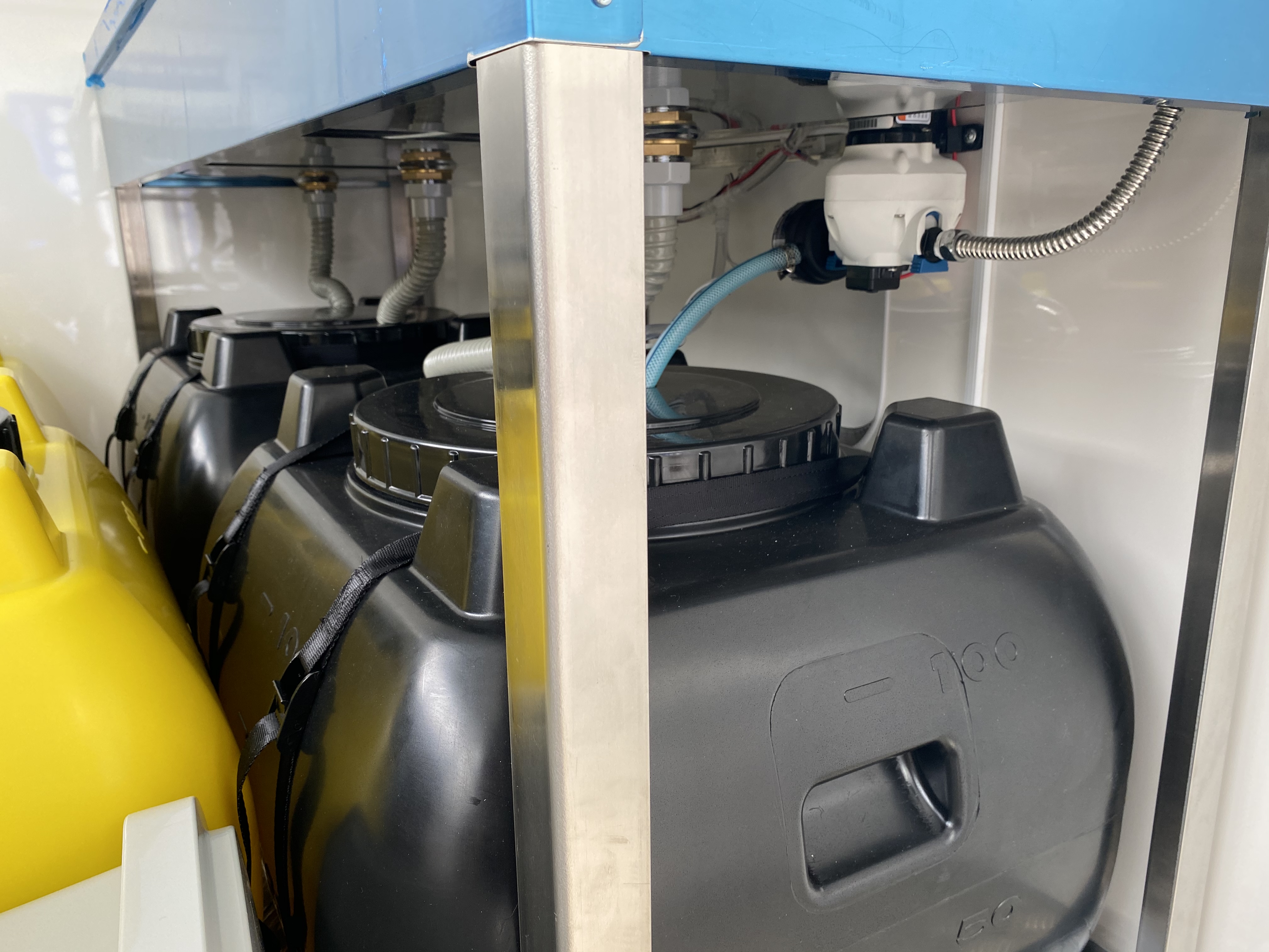 ↑車載式の給排水タンク。大容量100lタンクをふたつ置くことで、ゆとりをもって水を使えます。