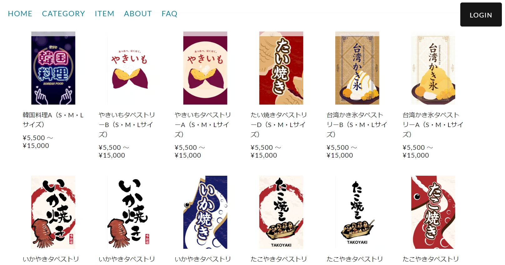 いま売れ筋なのは、秋祭りや冬祭りで活躍する、からあげ、牛串、いか焼きなど「あったか系」商品のデザインタペストリー。