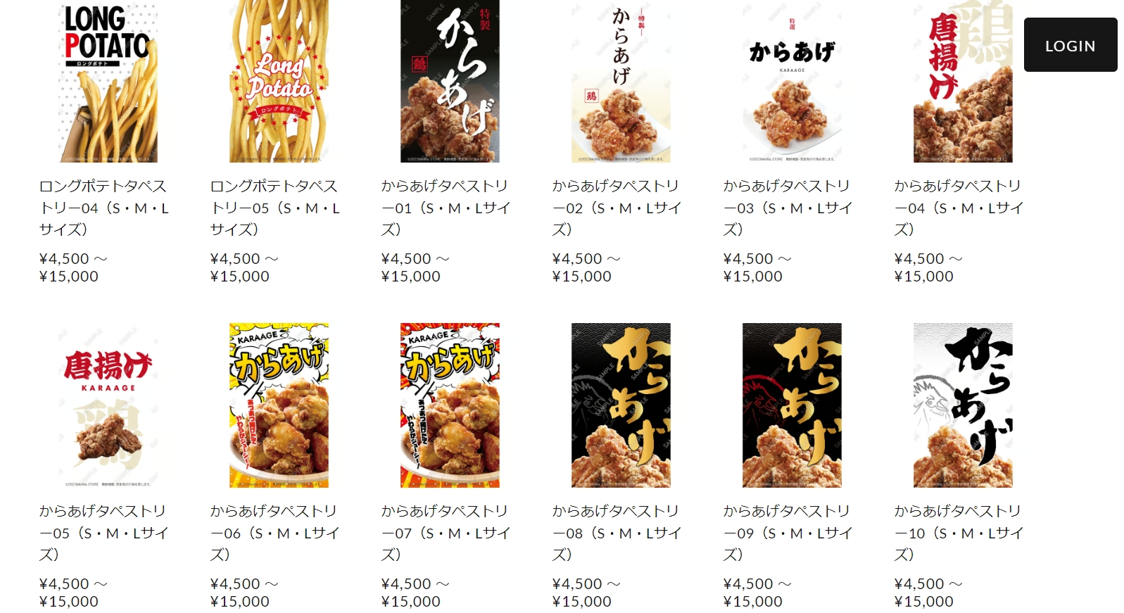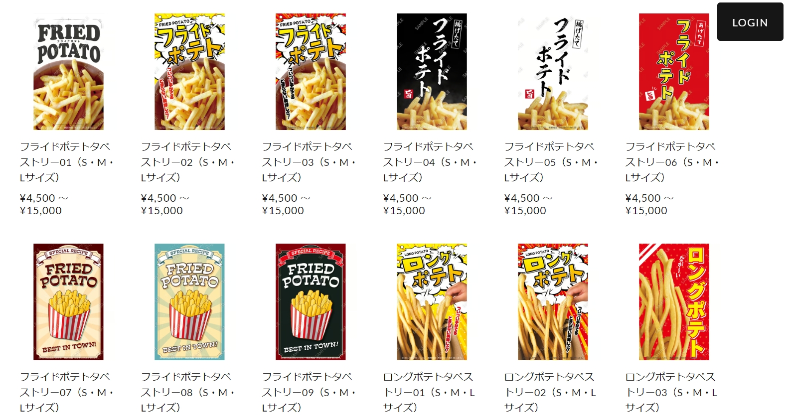 定番メニュー、季節メニュー、流行メニューのタペストリーが揃います。「新メニューを増やしたい」「期間限定で販売したいメニューがある」「初めてキッチンカーで営業する」というときにも、気軽に利用できます。