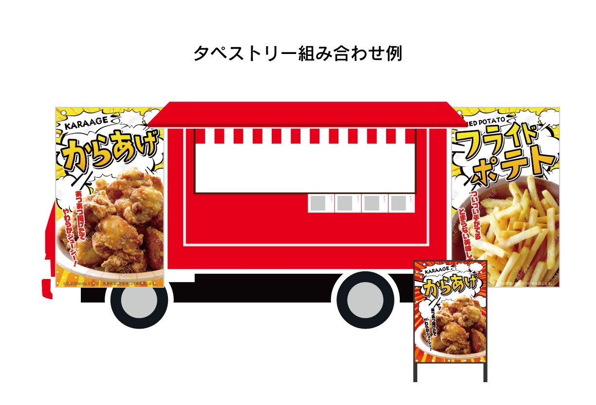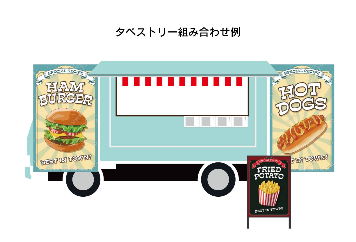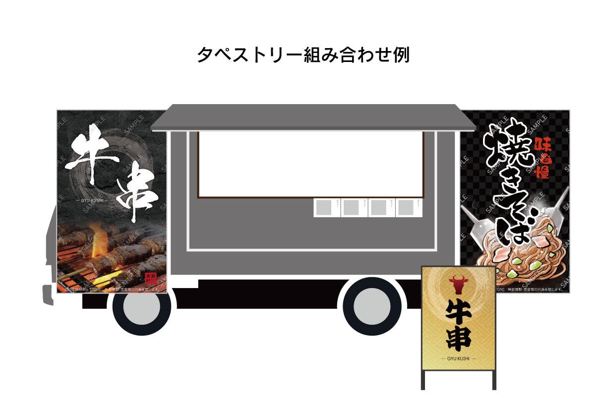 キッチンカー、屋台、露店等での販売時に使用できるデザインタペストリー(移動販売車用看板・幕・バナータペストリー)専門店です。