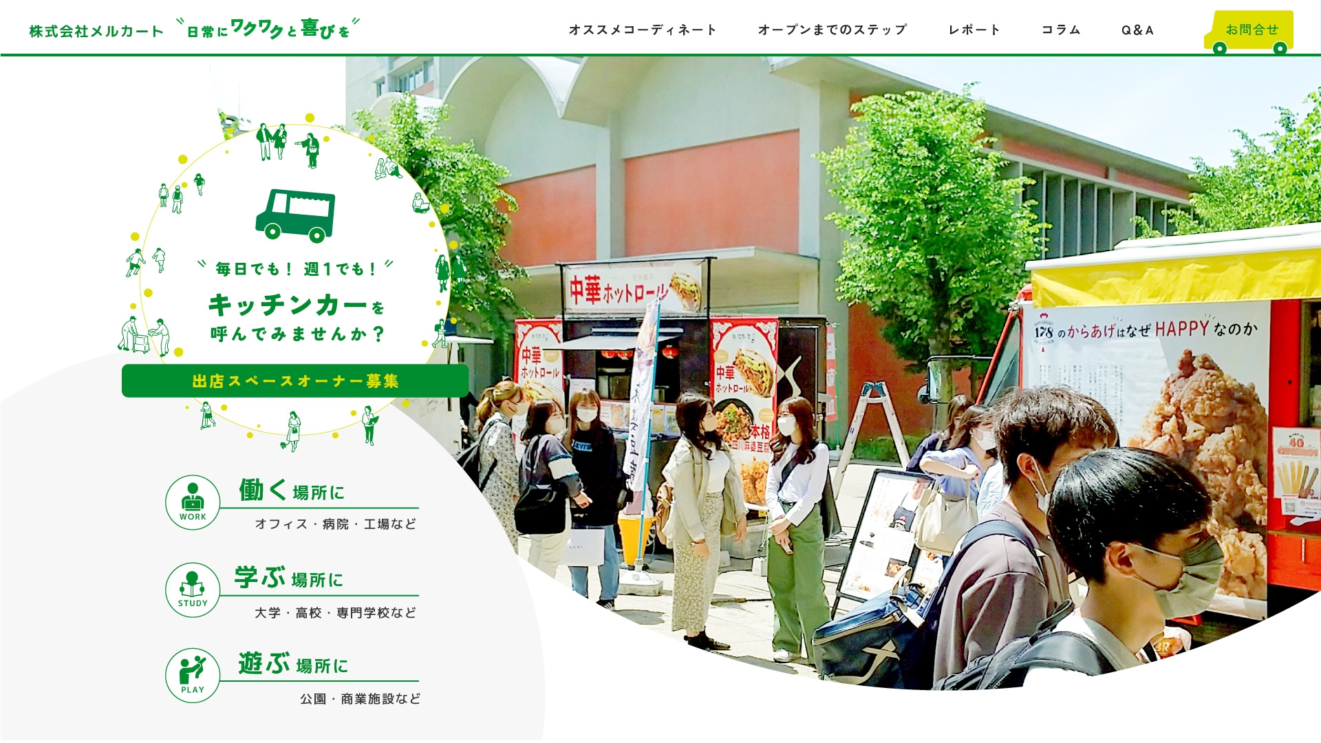 東海移動販売車組合・関西移動販売車組合を運営する株式会社メルカートは、土日祝日を中心とした単発のイベントはもちろん、オフィス・病院・工場など「働く場所」、大学・高校・専門学校など「学ぶ場所」、公園・商業施設など「遊ぶ場所」といったスペースにも、定期的なキッチンカー派遣を行っています。