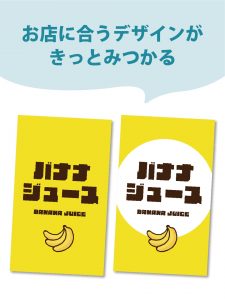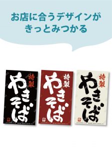 定番メニュー、季節メニュー、流行メニューのタペストリーが揃います。「新メニューを増やしたい」「期間限定で販売したいメニューがある」「初めてキッチンカーで営業する」というときにも、気軽に利用できます。