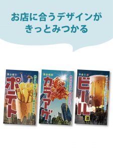 定番メニュー、季節メニュー、流行メニューのタペストリーが揃います。「新メニューを増やしたい」「期間限定で販売したいメニューがある」「初めてキッチンカーで営業する」というときにも、気軽に利用できます。