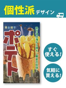 さらに!これからの季節に活躍する商品のタペストリーも勢揃い。定番人気のチュロスやトルネードポテト、ロングポテト、かき氷、からあげなどのタペストリーも多数揃うので、お見逃しなく!