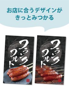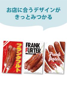 定番メニュー、季節メニュー、流行メニューのタペストリーが揃います。「新メニューを増やしたい」「期間限定で販売したいメニューがある」「初めてキッチンカーで営業する」というときにも、気軽に利用できます。