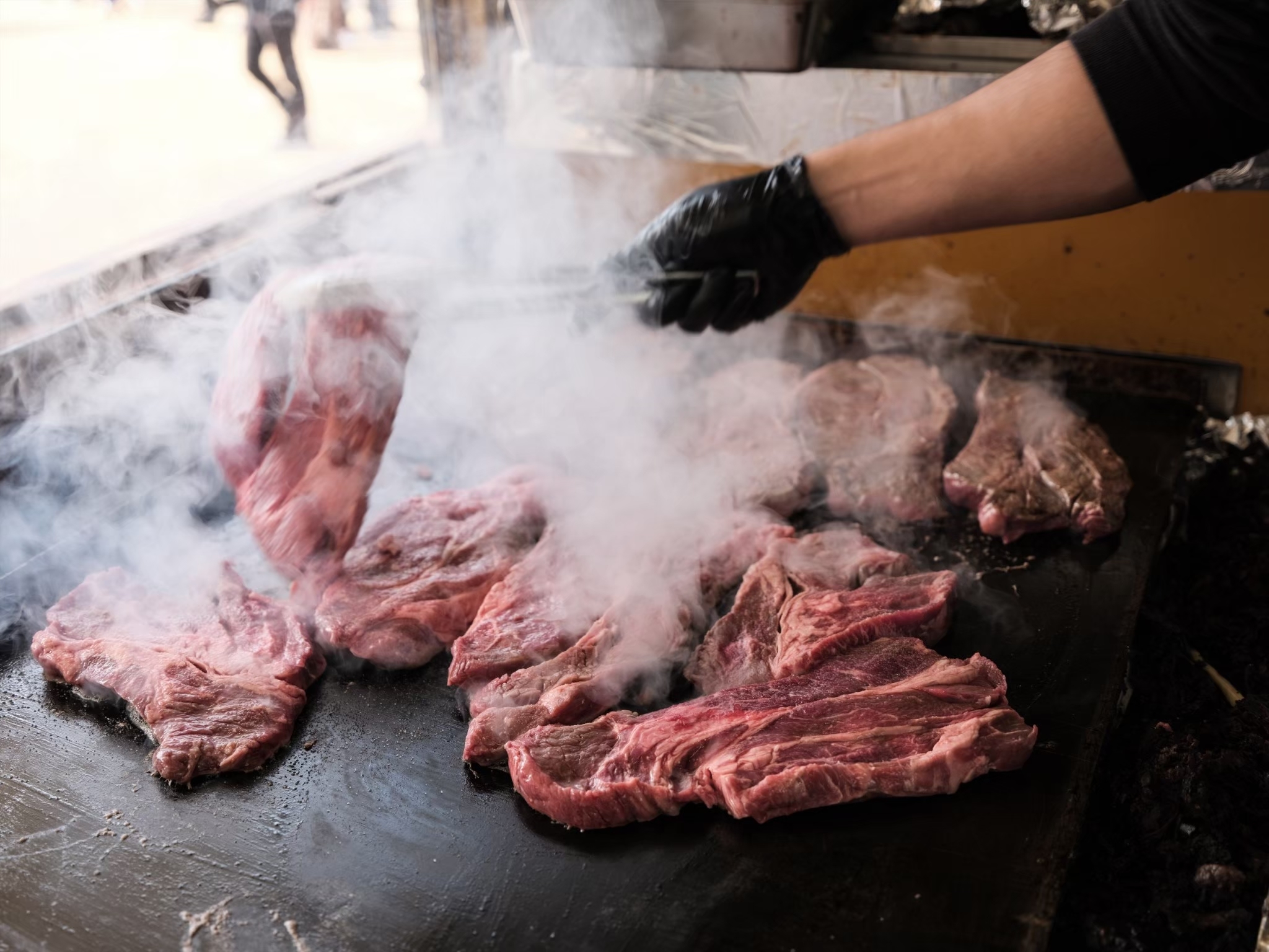 分厚いお肉を豪快に焼き上げる。漂う湯気と香りが食欲をそそる。