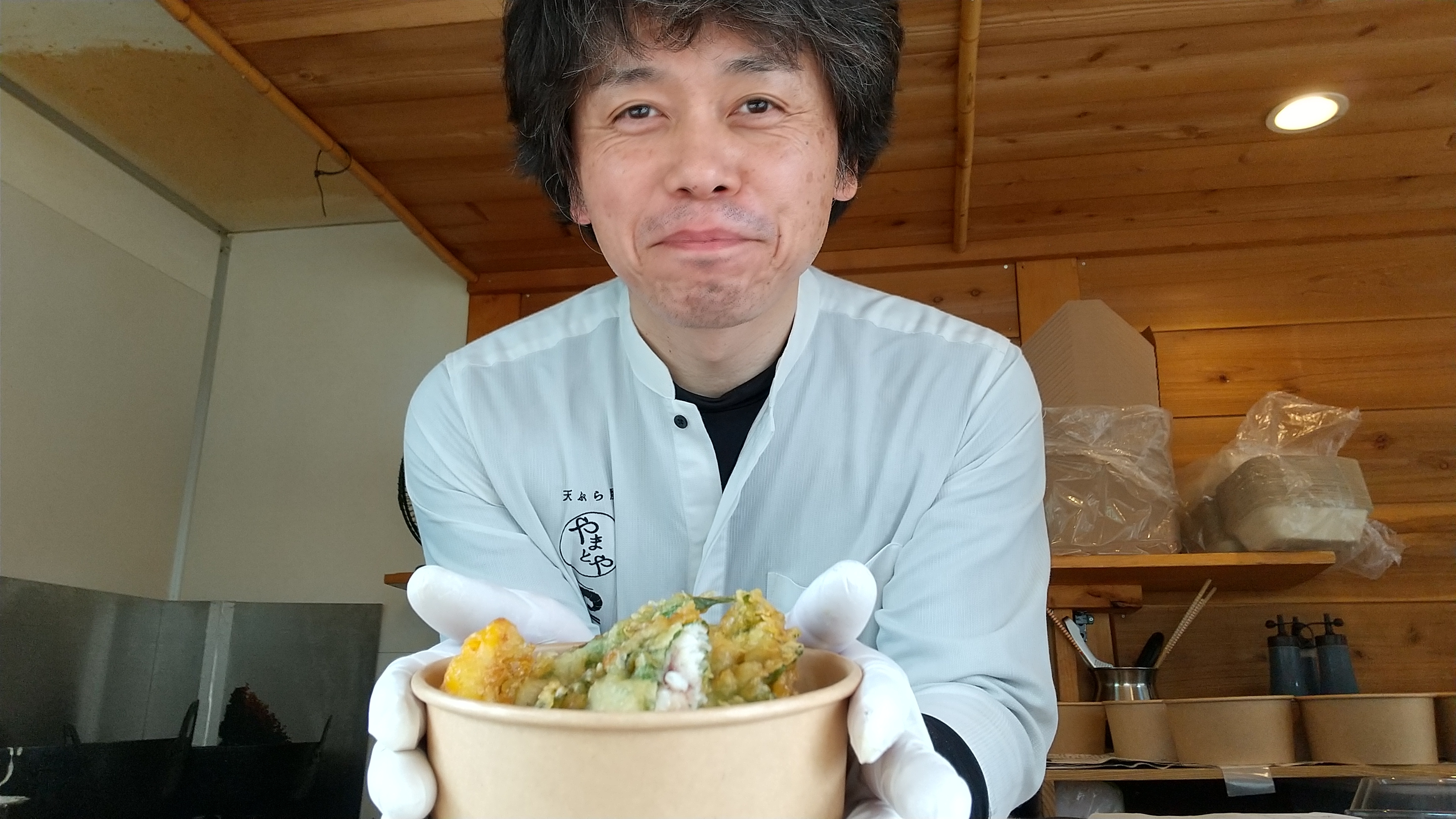 SNSやイベントアンケートでこうした声が聞こえるのは、天ぷら専門のキッチンカー「天ぷら屋やまとや」。それもそのはず。やまとや店主の高木さんは、ふぐ調理師免許も持つ本格的な板前です。素材へのこだわり、調理法へのこだわり、何より「お客さまに美味しいものを届けたい」というプロのこだわりから生まれる絶品天丼は、今や多くの常連客を生んでいます。
