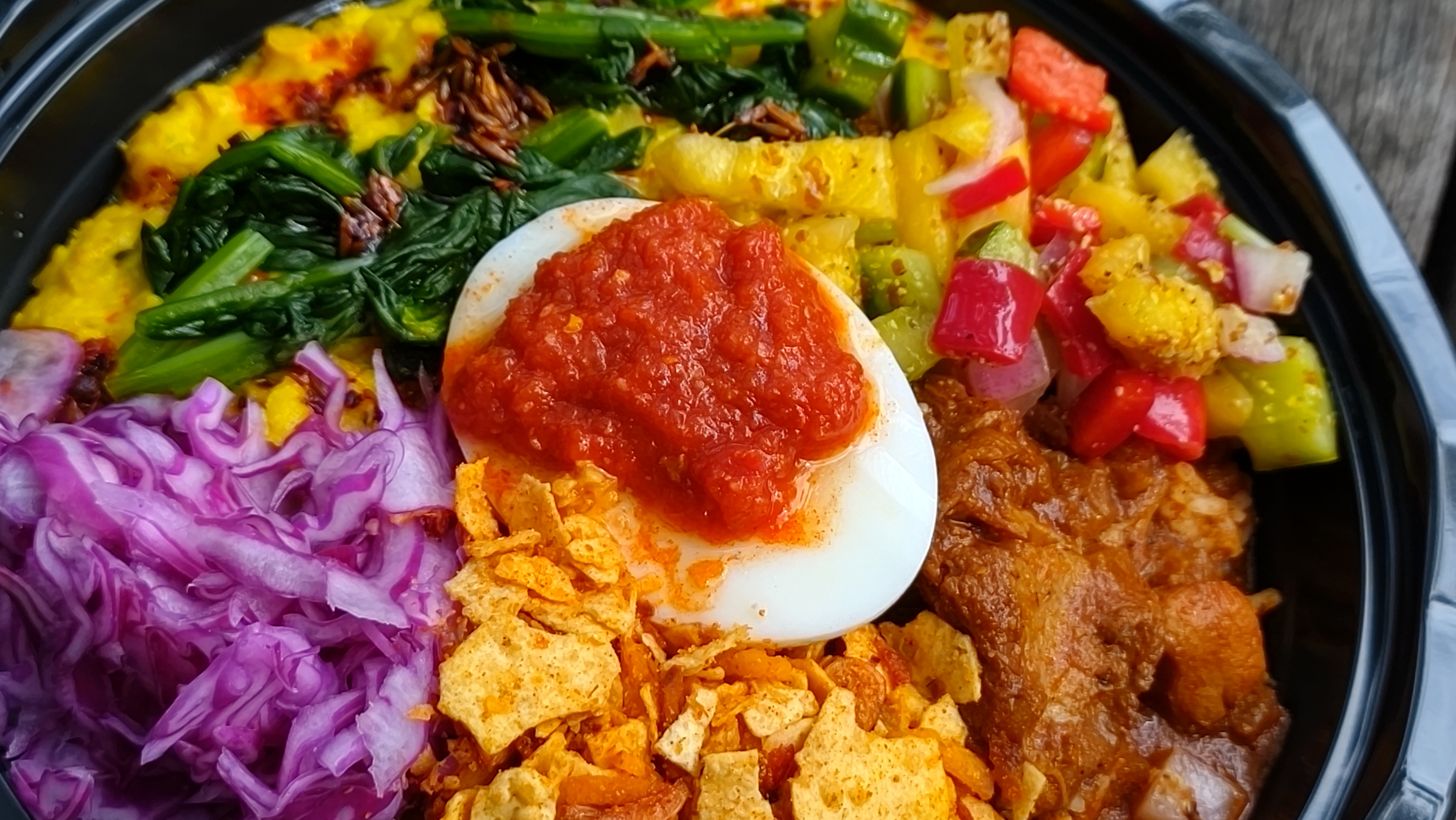 野菜をふんだんに使用したスパイスの効いたカレーとココナッツベースのカレーのあいがけカレーが基本。その上に、日替わりのお惣菜が数種類入っています。