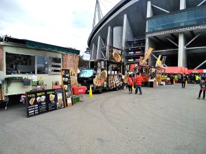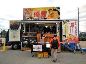 東海移動販売車組合は、名古屋グランパスのホームゲームで毎試合スタジアムグルメの運営を担当しております。今回も移動販売車(キッチンカー・フードトラック)を中心とした46業者を手配。多くの皆さまにご利用いただきました。