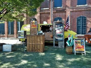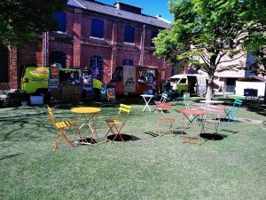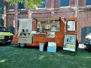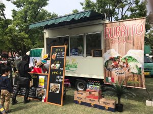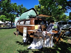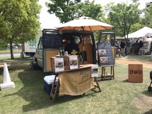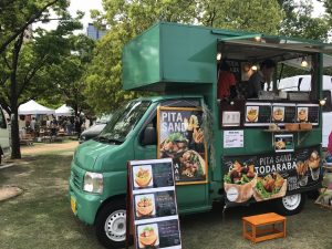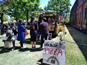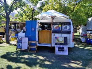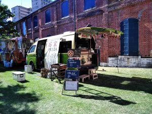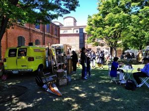 芝生の広がる公園が広がる赤レンガ倉庫前を会場としているため、まるで欧米の田舎町で開かれる蚤の市に訪れたかのようなロケーション。東海移動販売車組合からも、この素敵なイベントに、イベントにふさわしいキッチンカーを手配させていただきました!
