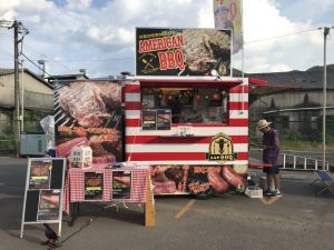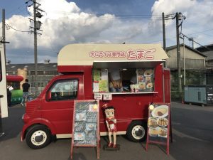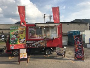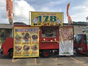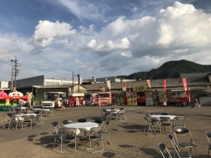 こちらは、岐阜県加茂郡にある企業様の「ファミリー祭」に派遣したキッチンカー。牛串、たこ焼き、からあげ、ステーキ、オムライスなど、バラエティ豊かな5台を手配いたしました。