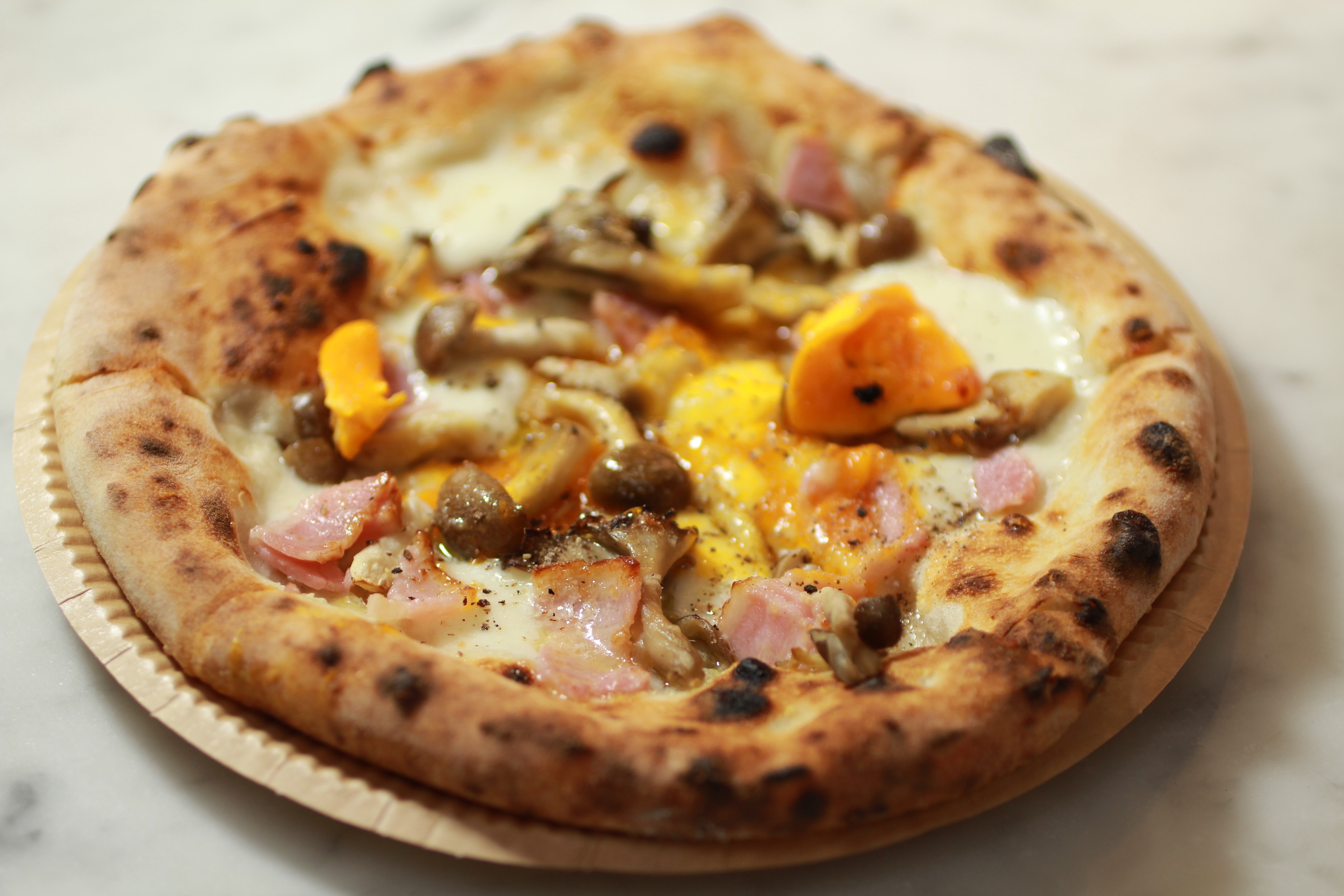 5、ベーコンときのこの半熟卵のピザ / pizza mog