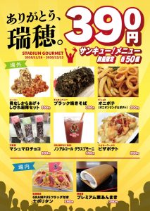 スタジアムグルメでは、パロマ瑞穂スタジアムへの感謝の気持ちを込めて各店舗50個限定でサンキュー!(390円)メニューを販売。あっという間に完売となりました。ご利用いただいたサポーターの皆さま、ありがとうございました!