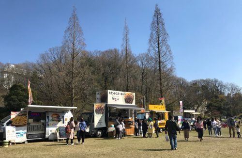 広い公園で、キッチンカーのできたてグルメを味わってくださいね♪