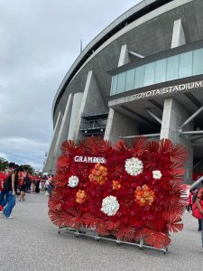 女性サポーターの皆さまに喜んでいただけるようにイベントの一環で生花を配っていました。