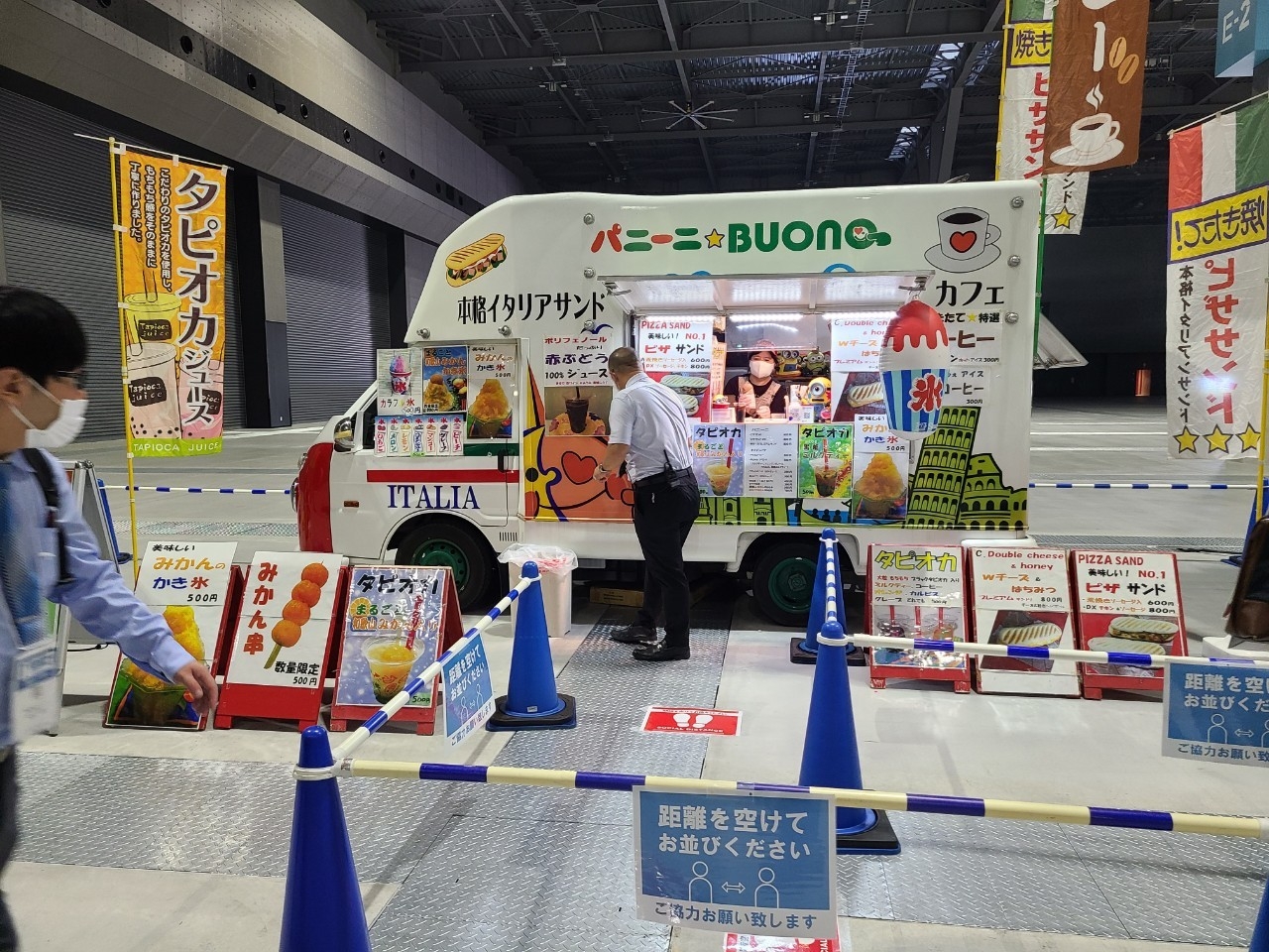 屋外、屋内に並ぶキッチンカーによるフードコート。展示会のランチタイムを、鮮やかに彩りました!