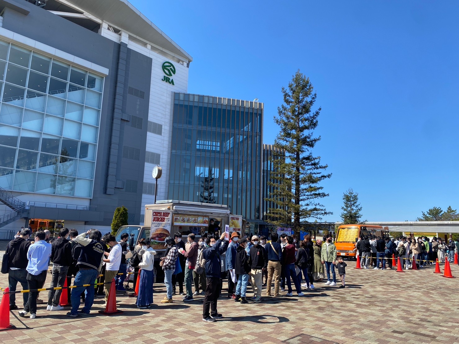 3月18日(土)19日(日)に中京競馬場(愛知県豊明市)で開催された第2回中京競馬。今回のフードイベントは、バーガーフェス in CHUKYO。各キッチンカーが、「CHUKYO 70th Anniv.」ロゴの刻印が入った特別なハンバーガーを販売しました。