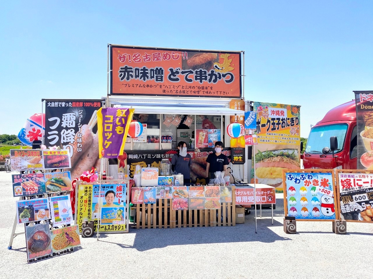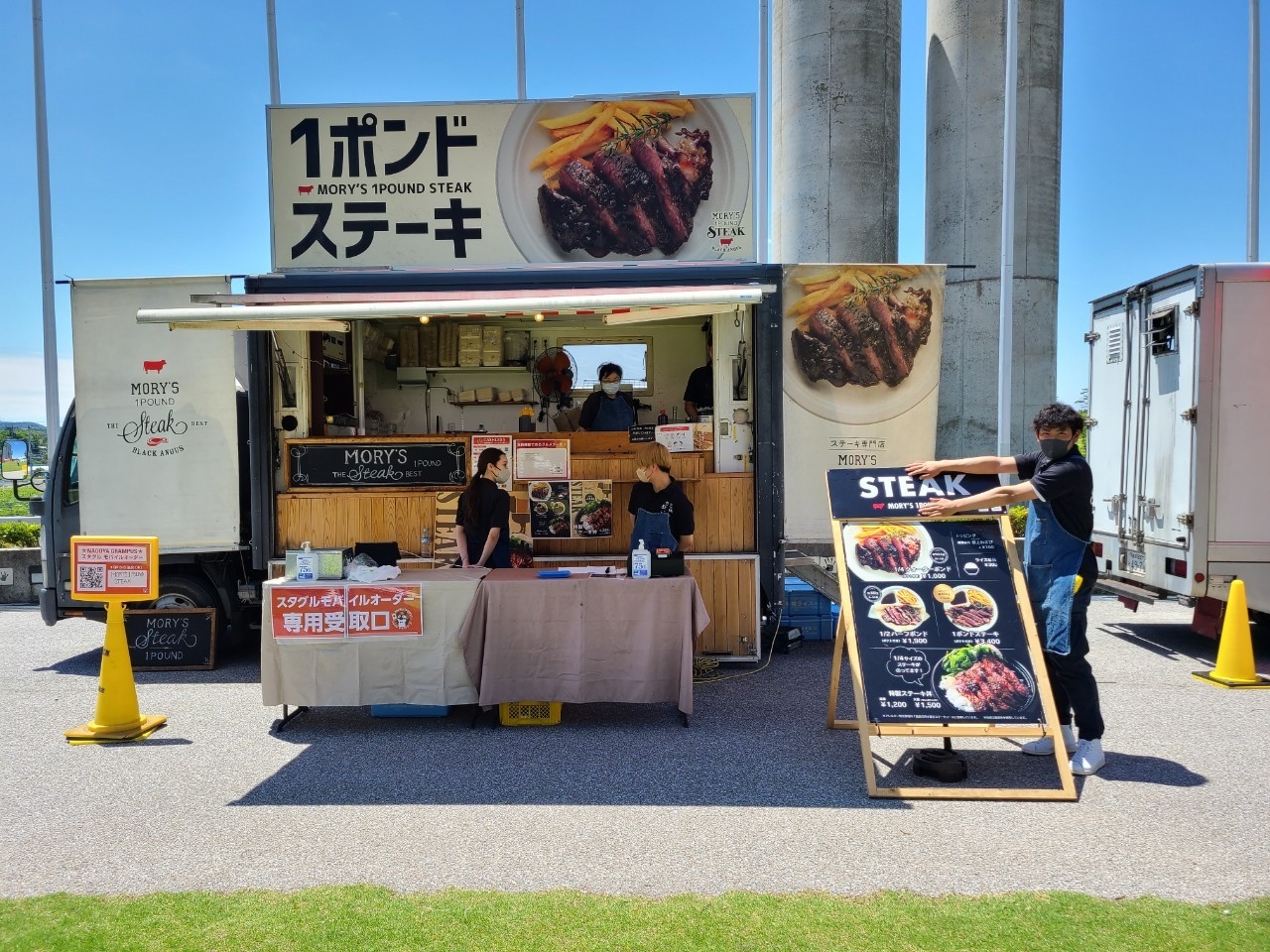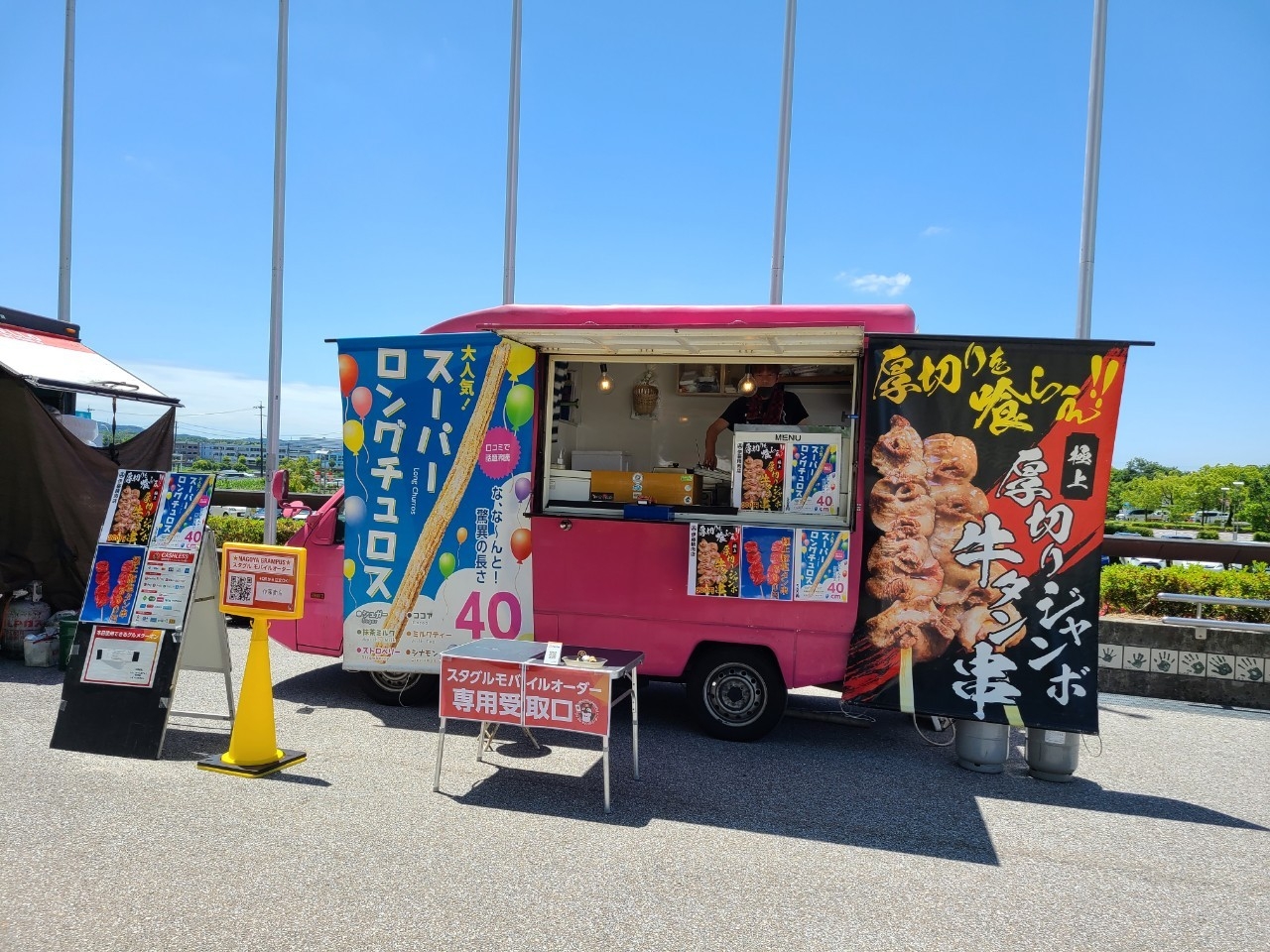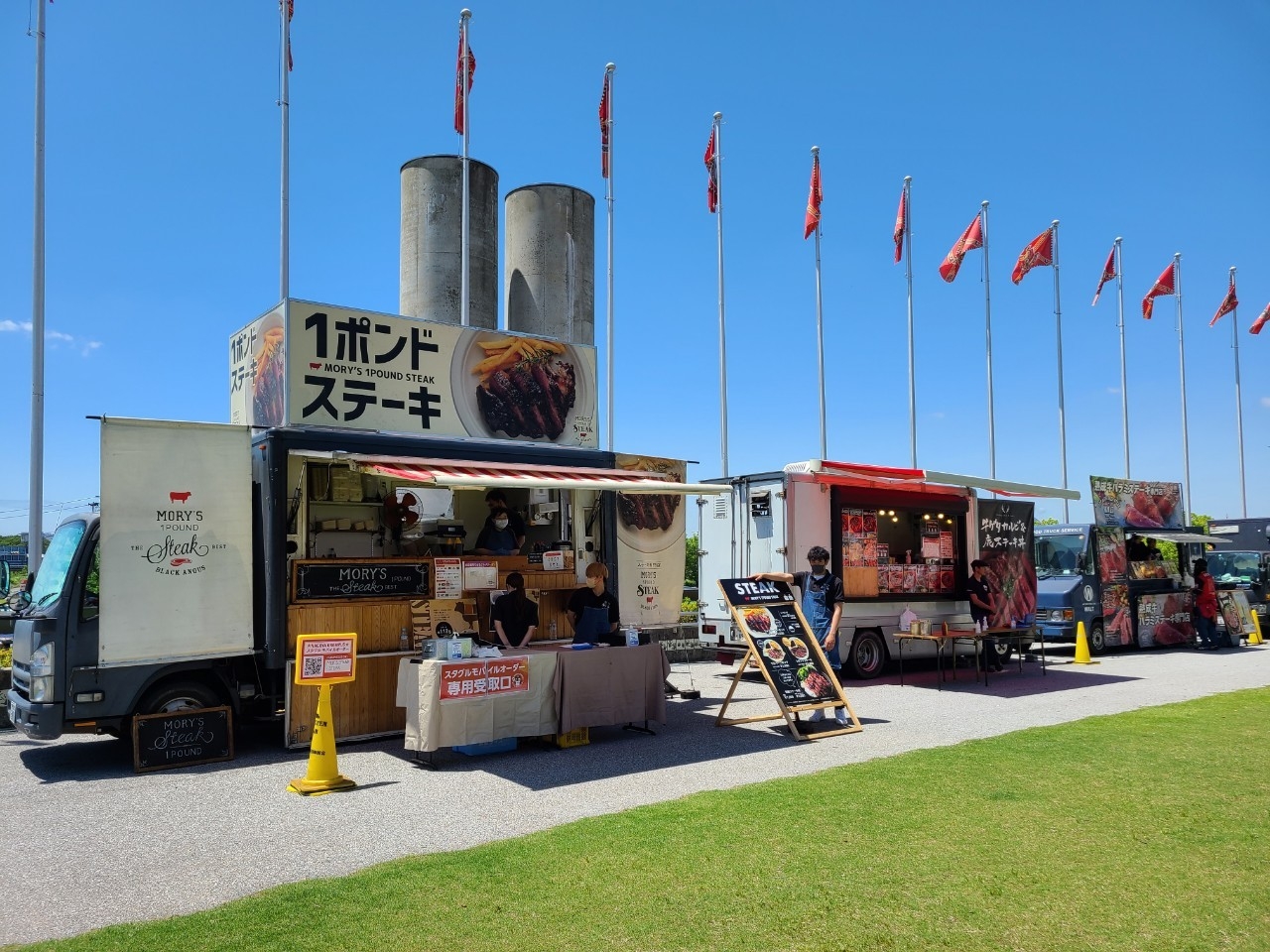 快晴の下並んだ東海移動販売車組合のキッチンカー。この日のスタジアムグルメでは「肉祭り#ビーフ」が行われ、美味しい牛肉メニューがずらり勢揃いしました。ご来場いただいた皆さま、ご利用いただいた皆さま、ありがとうございました!
