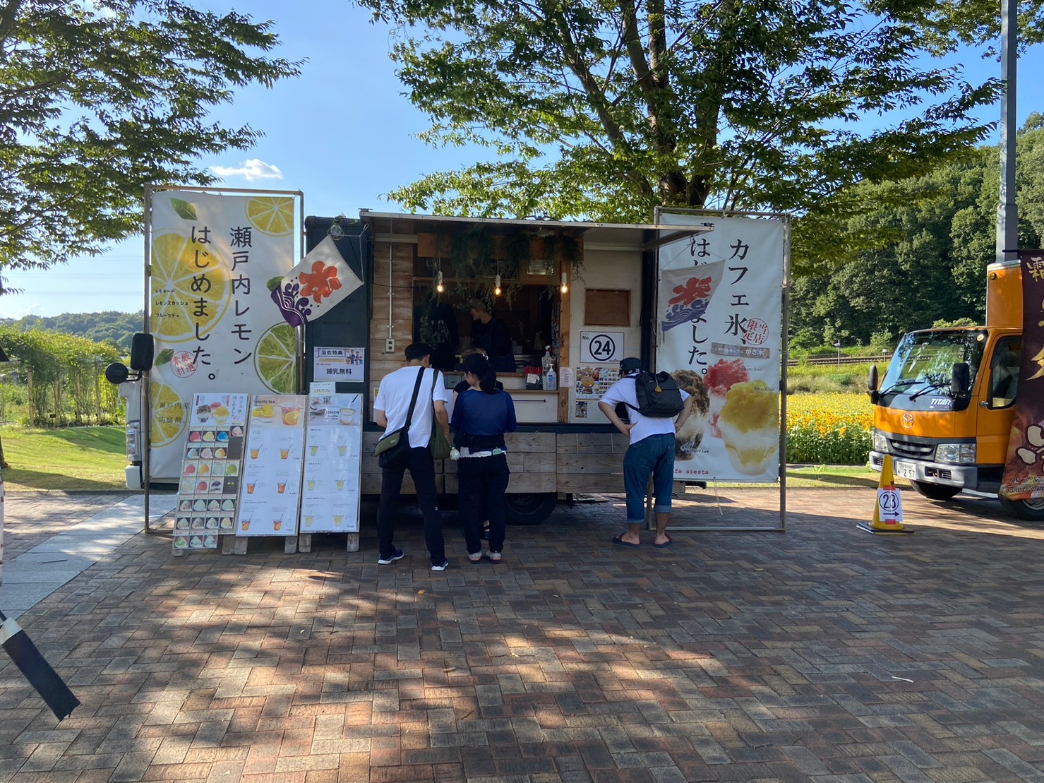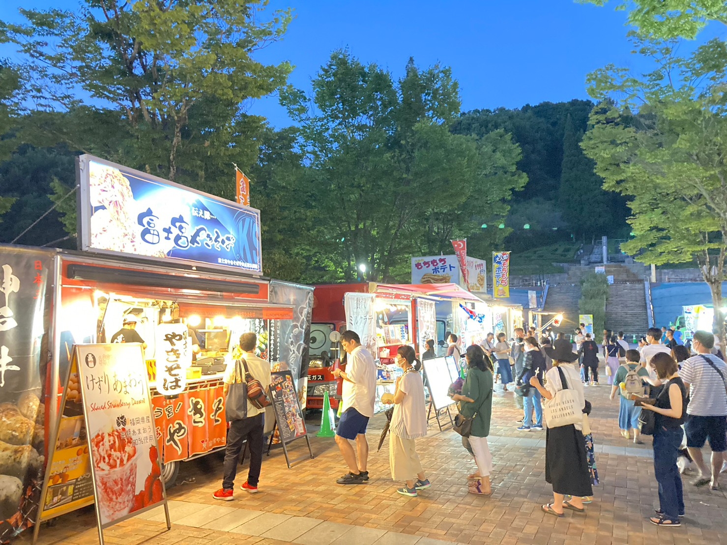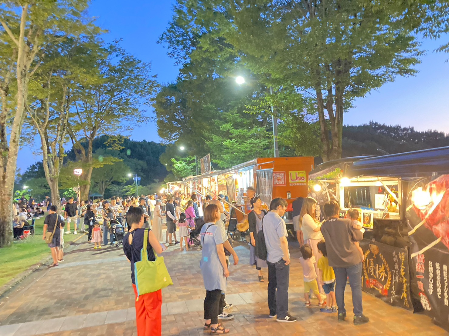 ずらり並んだキッチンカー、随時くり広げられる大道芸人によるパフォーマンス、大型遊具やひまわりのライトアップなど盛りだくさんの内容でお届け。皆様の夏の思い出づくりのお役に立てたことと思います。