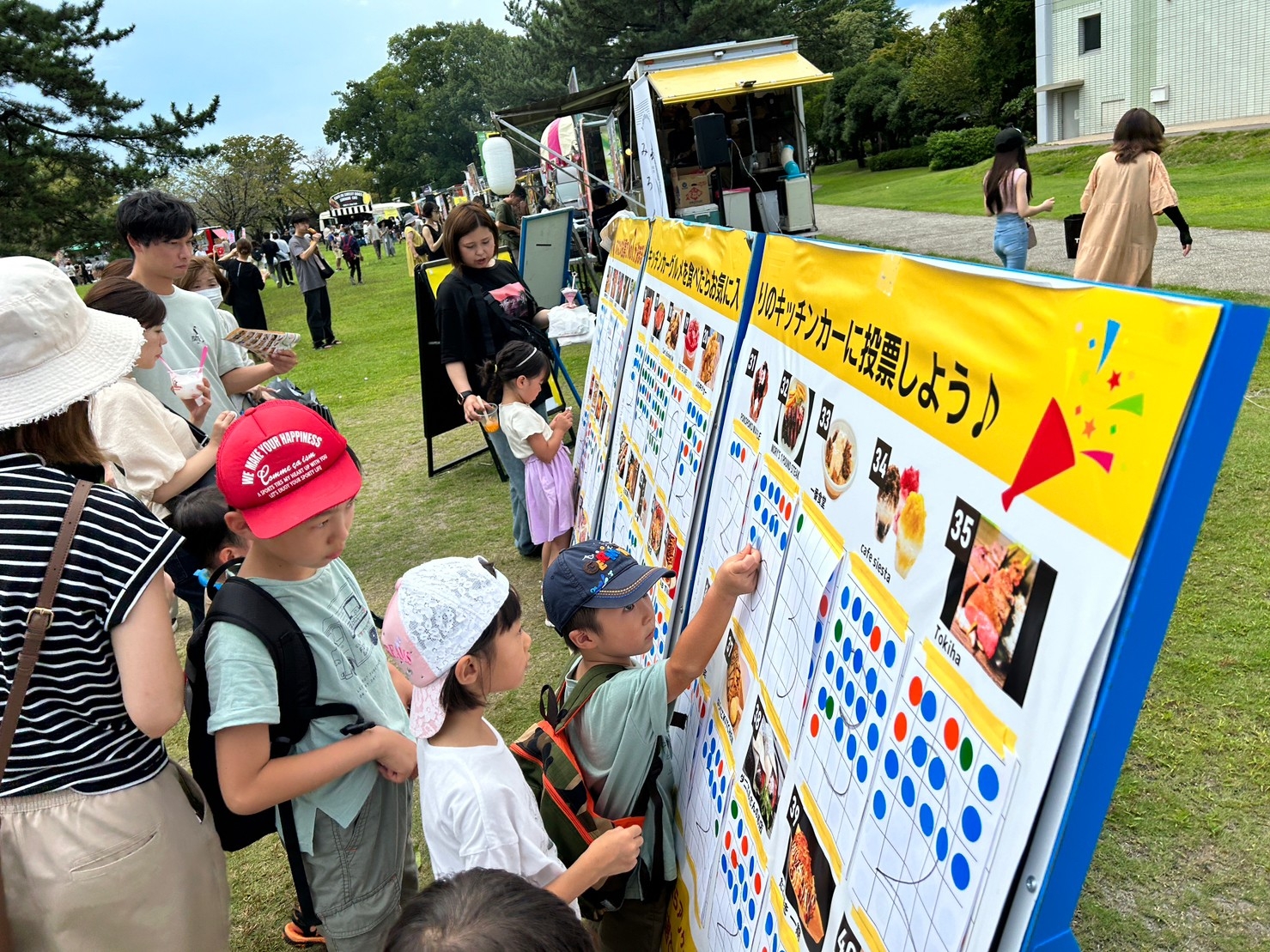 広い公園に、実力派キッチンカーが40台。「何を食べようかな」「どのキッチンカーに投票しようかな」と悩むのも、このイベントのお楽しみです。今回から投票が「シール制」になり、票の動向が一目瞭然、なかなか見ごたえがありました。