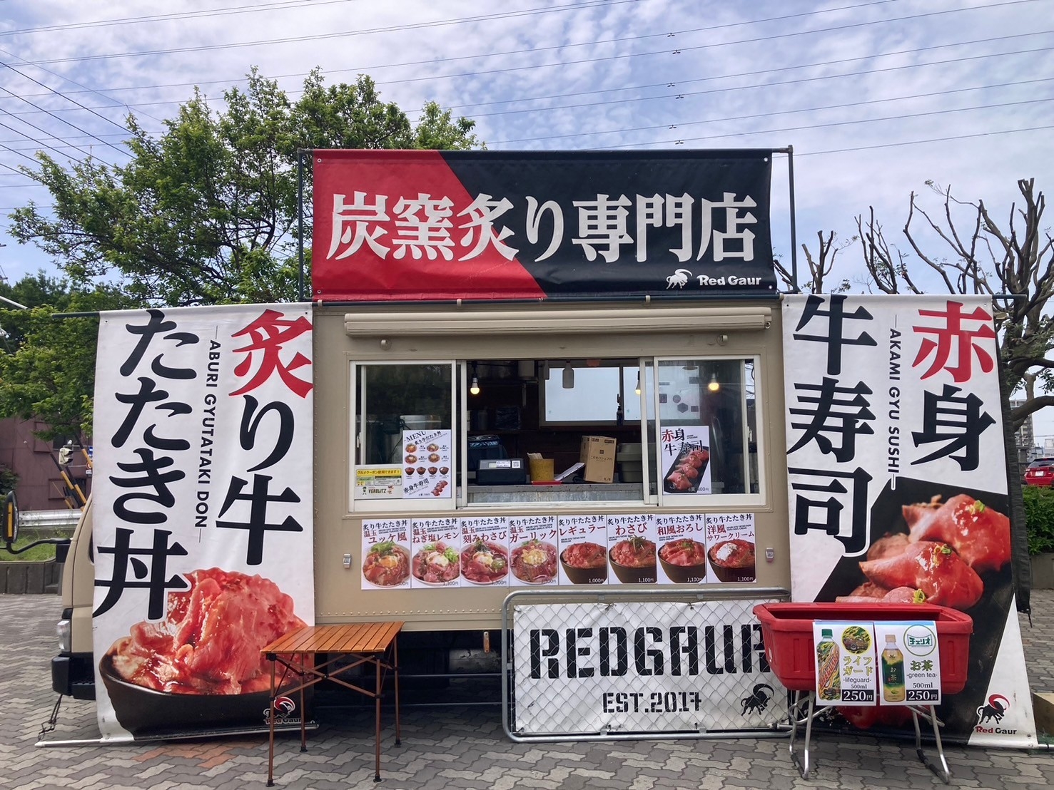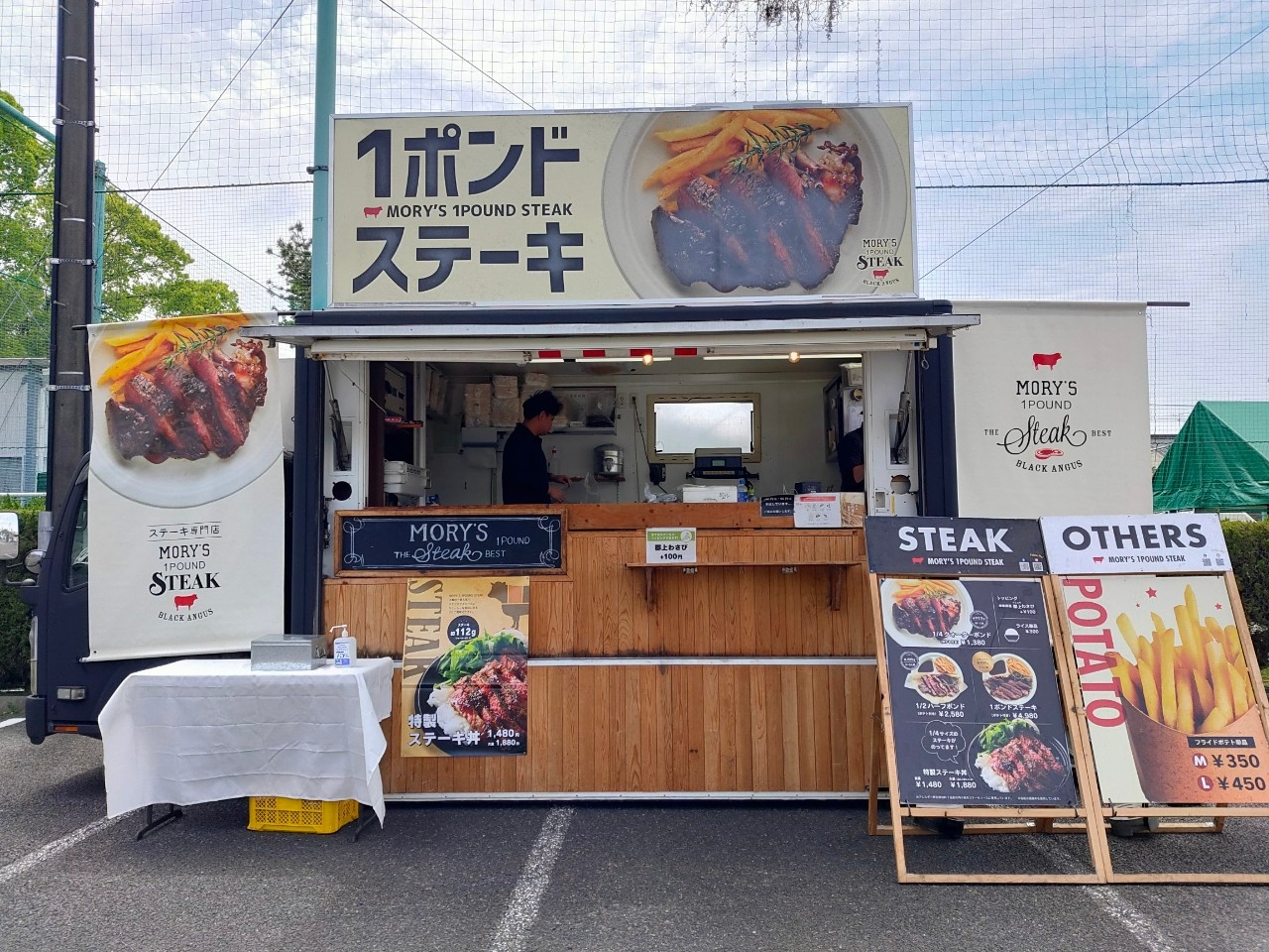 東海移動販売車組合のキッチンカーによるスタジアムグルメは、ステーキ丼、炙り牛たたき丼のほか、からあげ、ケバブ、たこ焼きなど人気メニューがずらり。