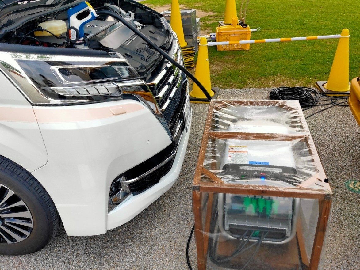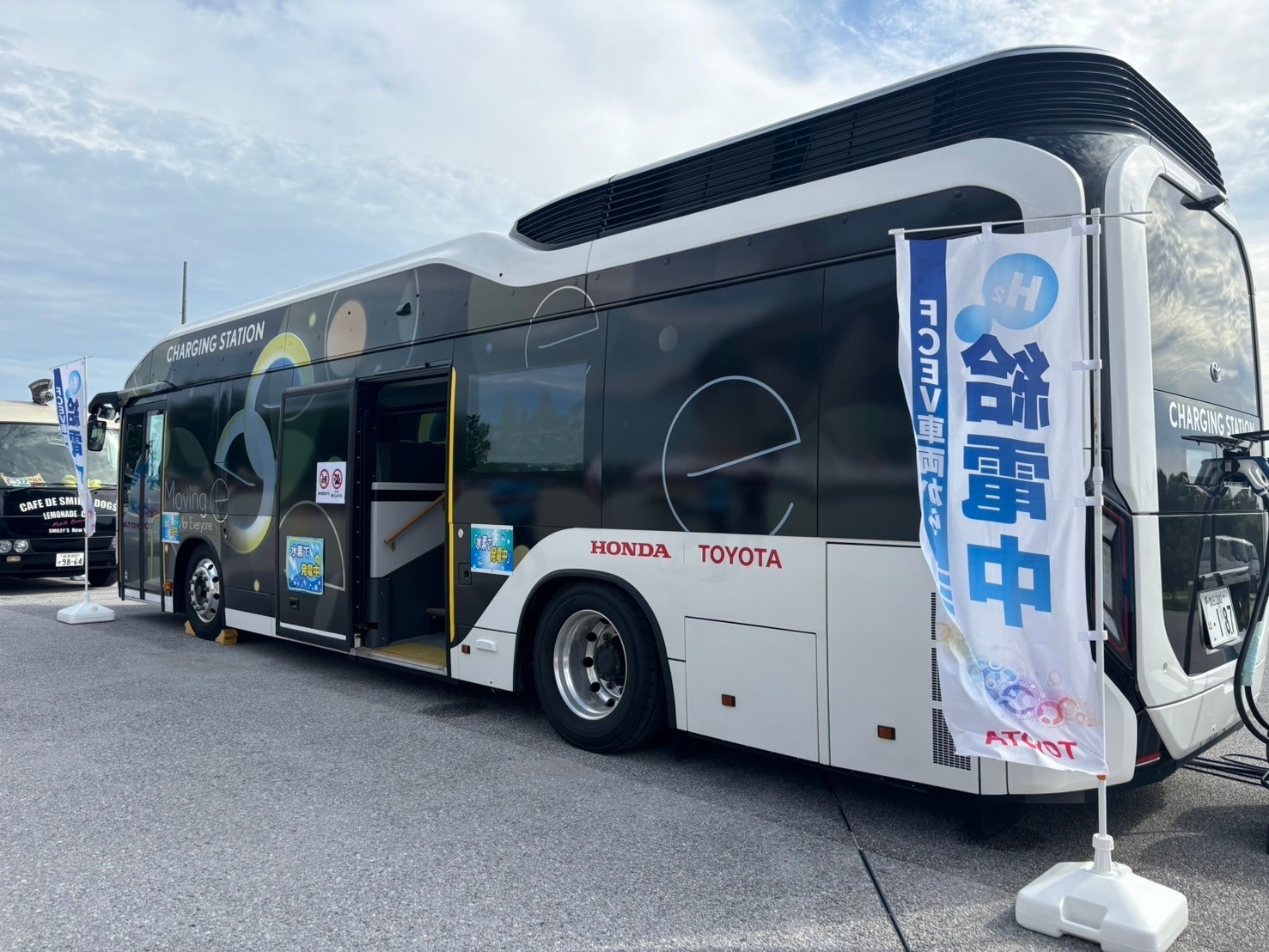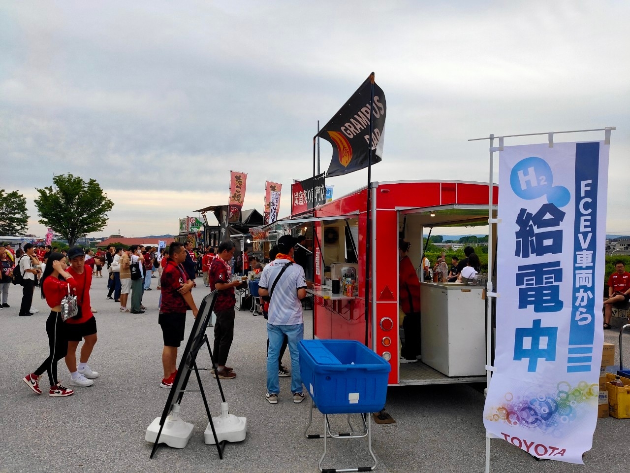 この日は「SDGsデー」。その一環として、トヨタ自動車株式会社および豊田市が所有する燃料電池バス、MIRAIおよびFCオフィスカー等を活用した給電を行うことで、豊田スタジアムのイベント広場全域において化石燃料による発電機を使用しない運営を実現しました。