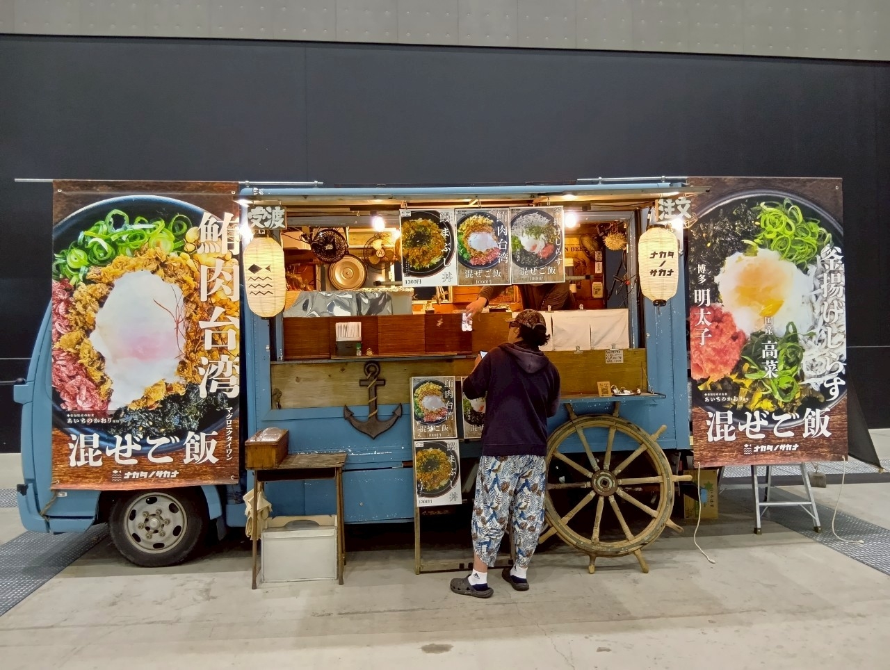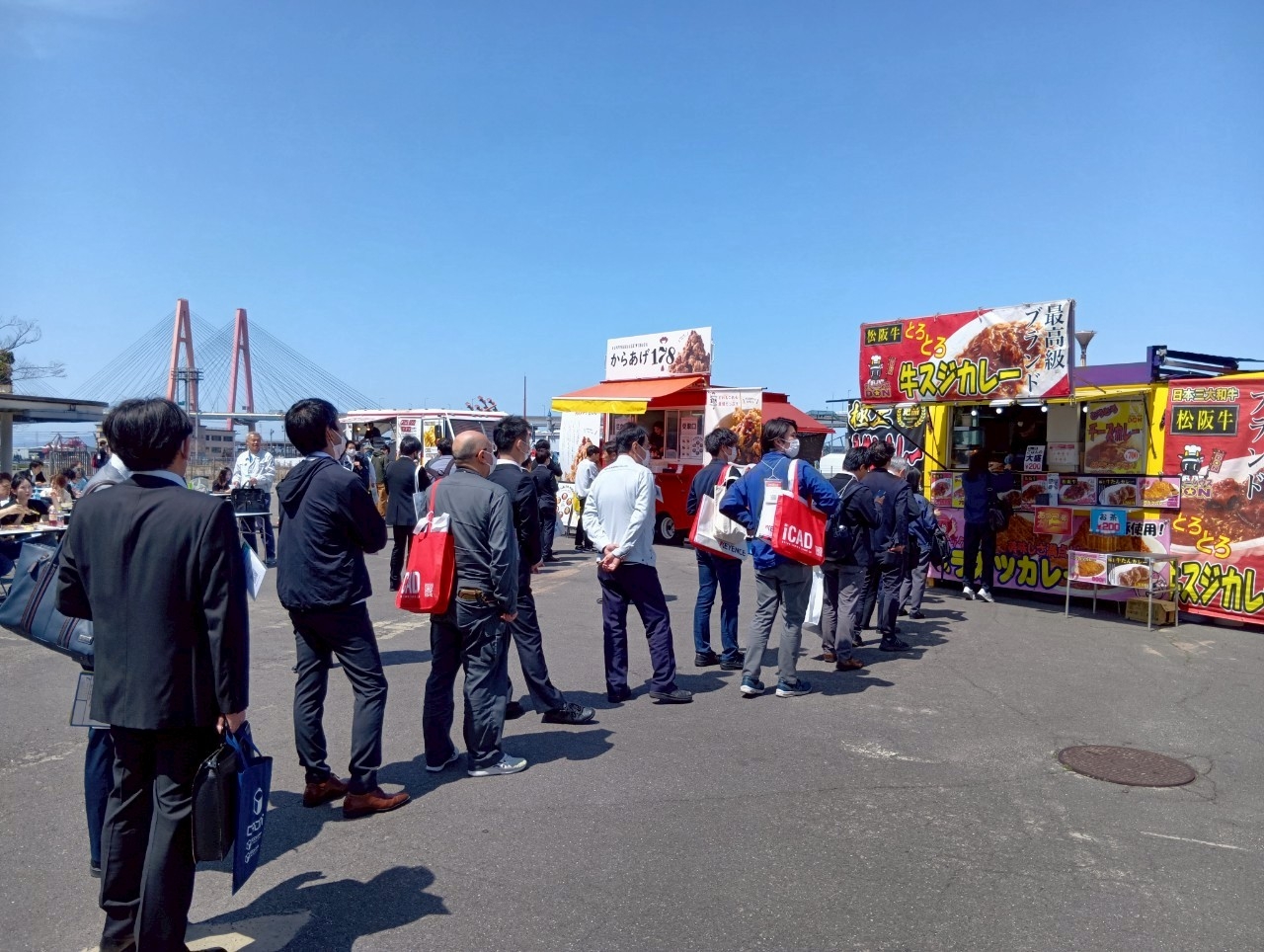 4月9日(水)から11日(金)までポートメッセ名古屋にて開催中の第10回ものづくりワールド[名古屋]に、東海移動販売車組合からキッチンカーを派遣しています。展示会場の屋内外にずらりと並んだ多彩なキッチンカーが、出展者の皆さま、来場者の皆さまに自慢のキッチンカーグルメを提供。皆さまの商談をグルメでサポートしています。