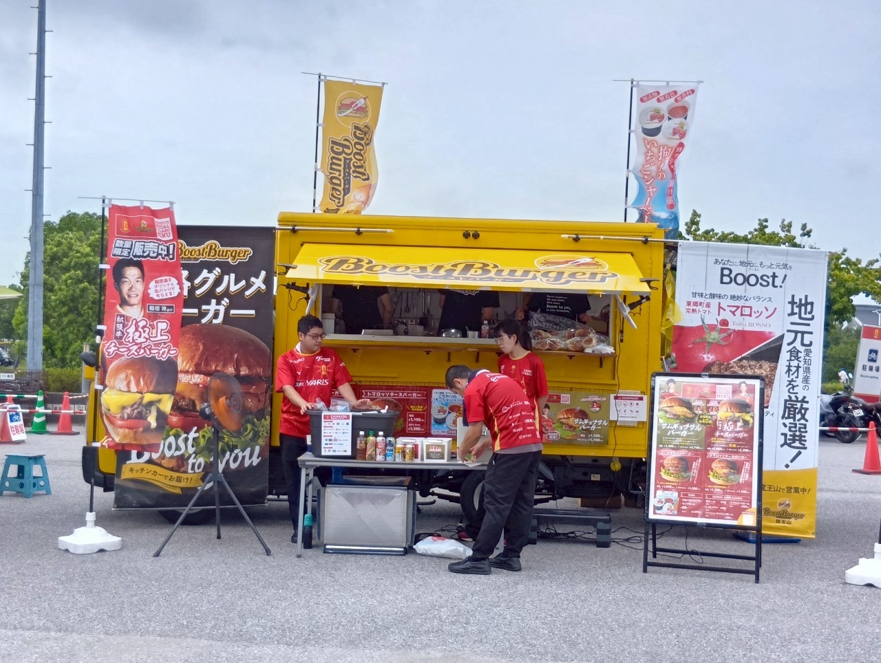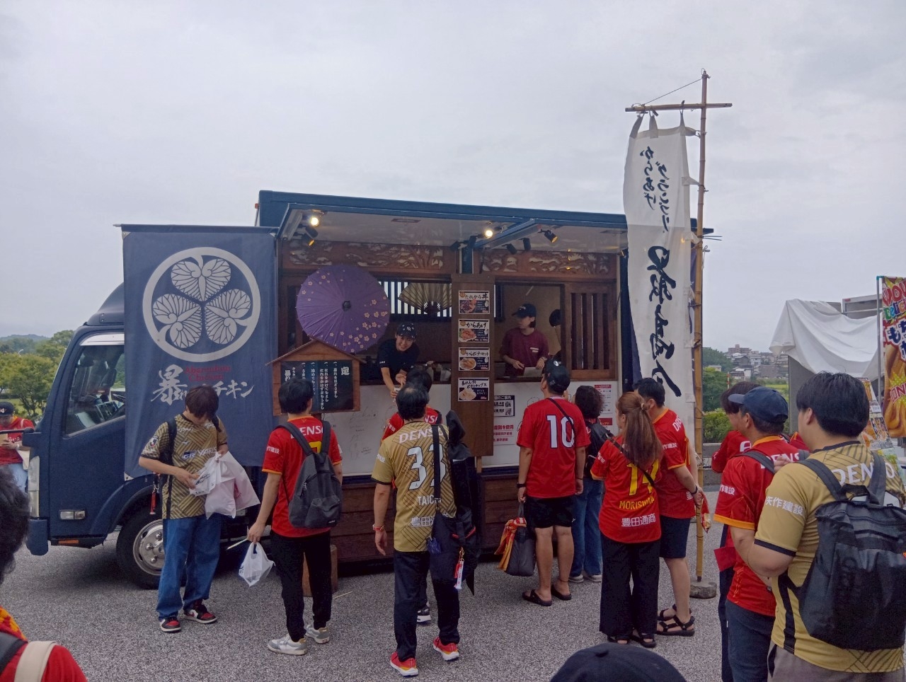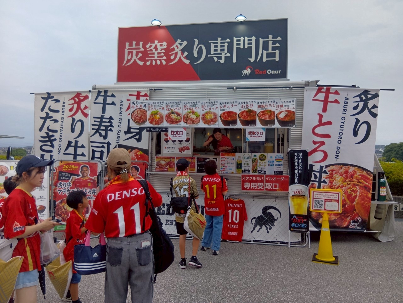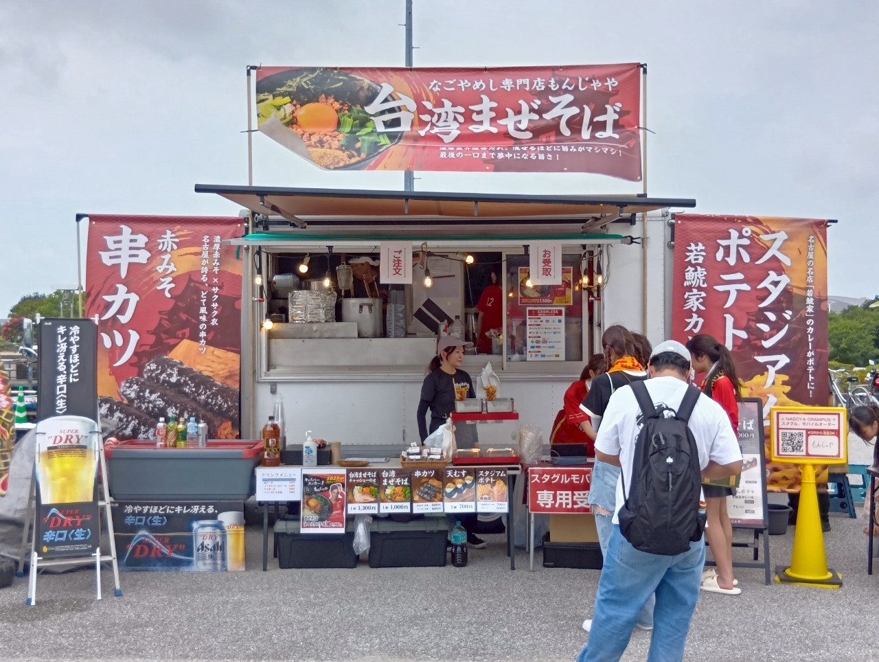 東海移動販売車組合のキッチンカーによるスタジアムグルメ、今回のテーマは「鯱の大祭典」1試合目を盛り上げるための「肉祭り」! スタミナたっぷり肉グルメで暑さも吹き飛ばします。
