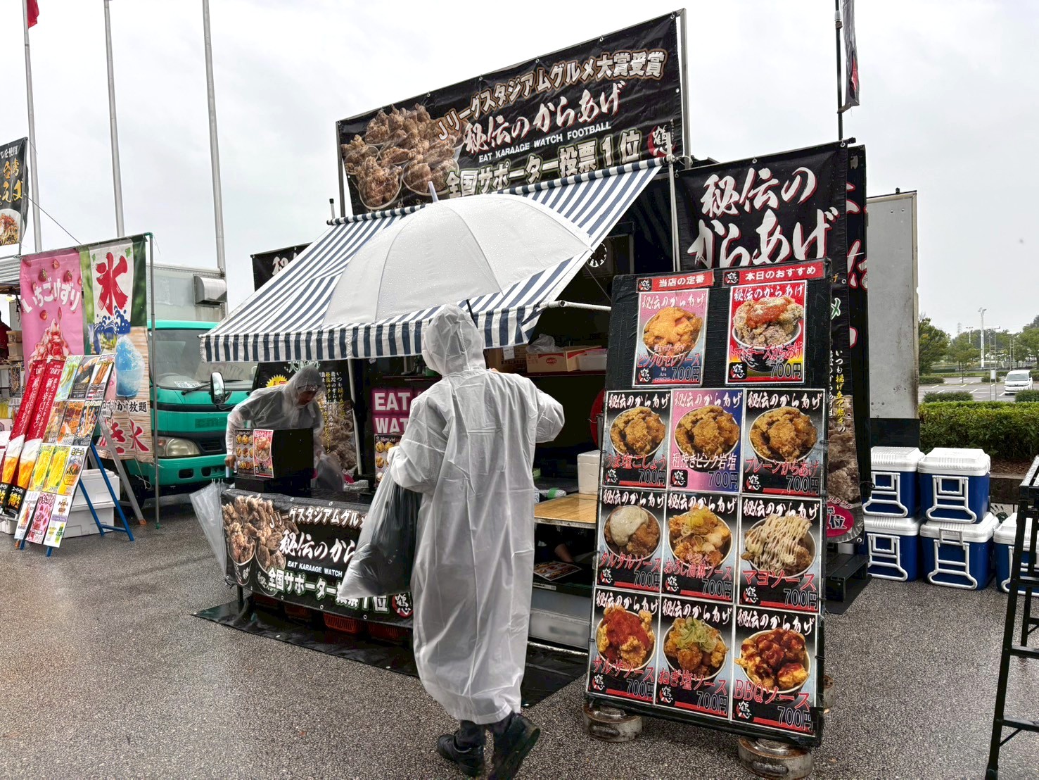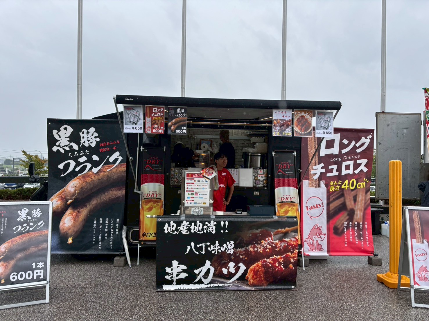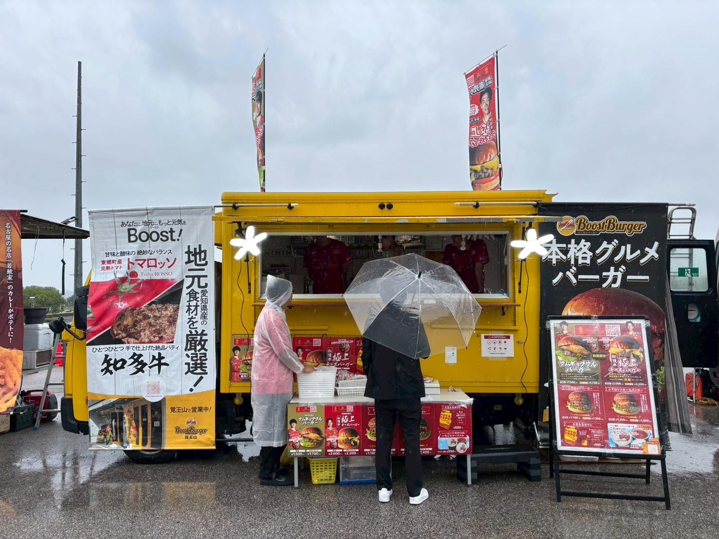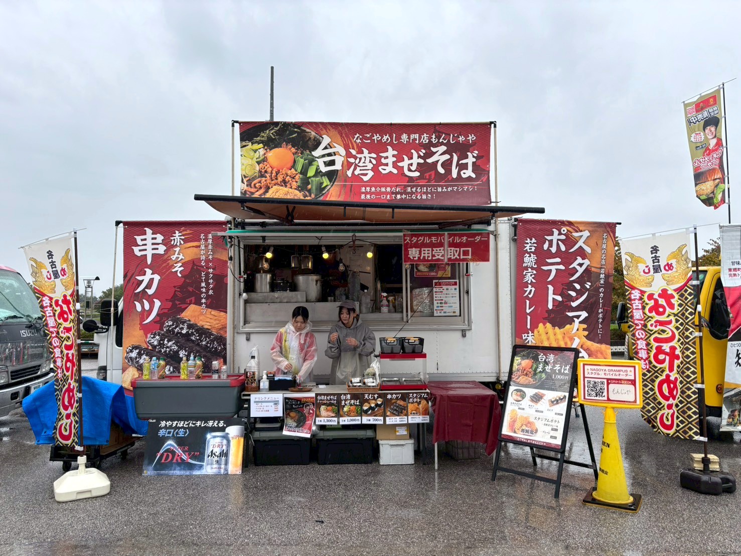 東海移動販売車組合のキッチンカーによるスタジアムグルメ、今回のテーマは「なごや飯」!台湾まぜそば・天むす・カレーうどん・みそかつ・あんバターなど名古屋名物グルメが勢揃い。