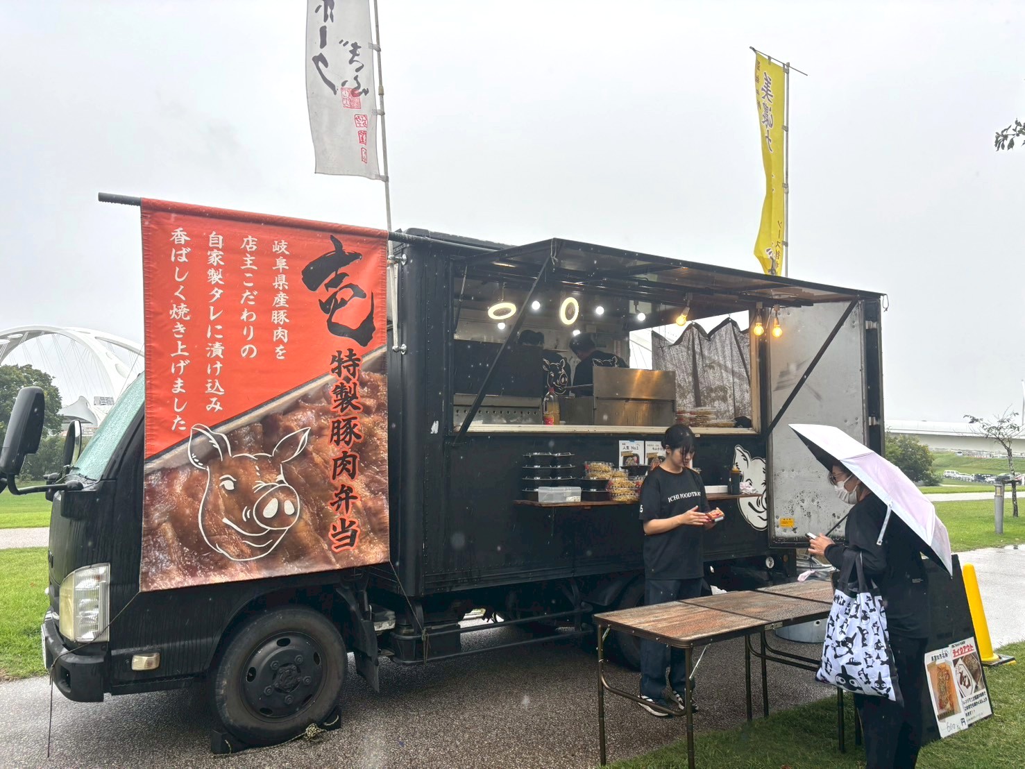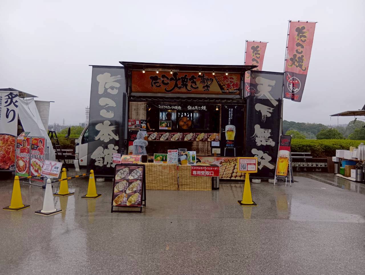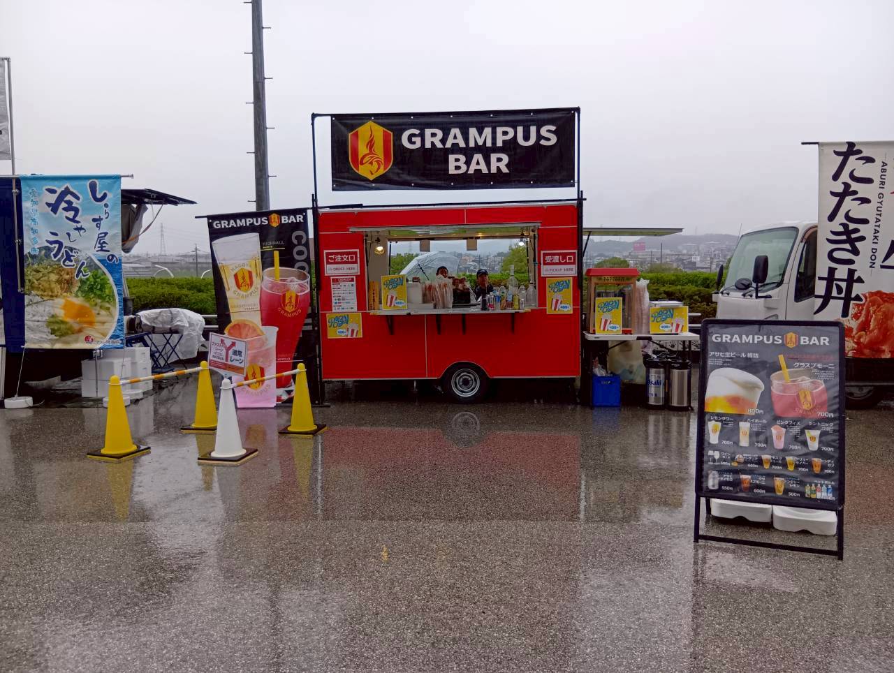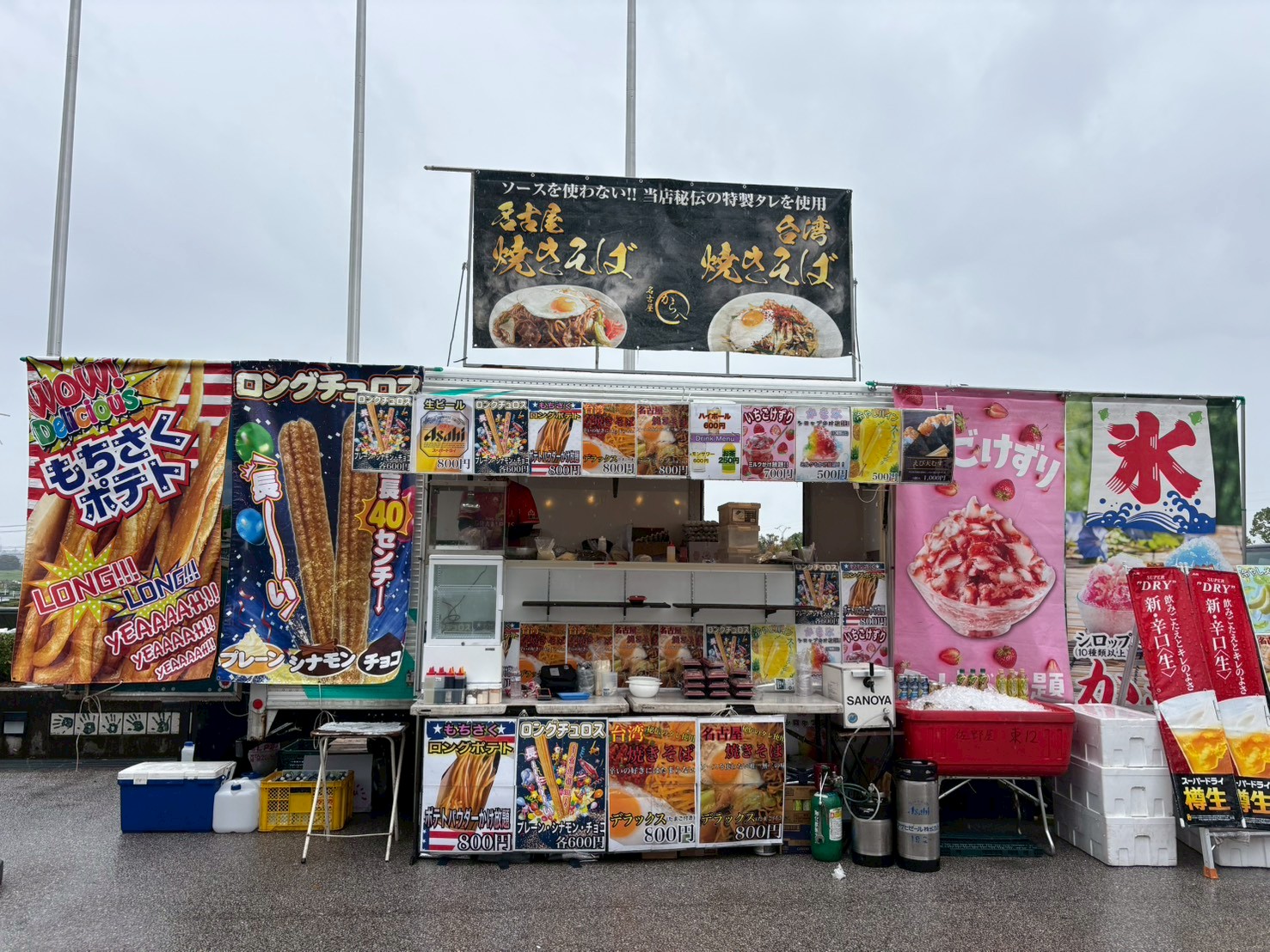 東海移動販売車組合のキッチンカーによるスタジアムグルメ、今回のテーマは「なごや飯」!台湾まぜそば・天むす・カレーうどん・みそかつ・あんバターなど名古屋名物グルメが勢揃い。